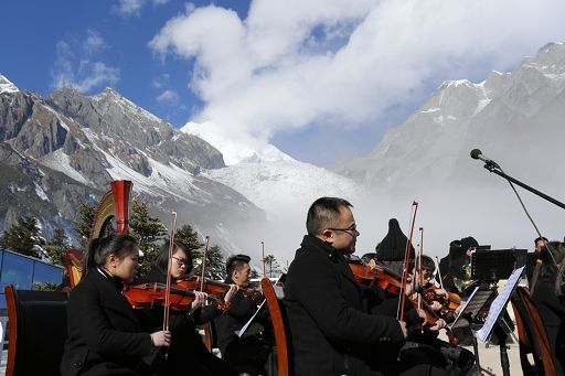 四號(hào)營(yíng)地,晴空萬(wàn)里、風(fēng)和日麗,清澈的高原天空藍(lán)得澄明醉人,來(lái)自四川交響樂團(tuán)和民間的200多位樂手共同在海拔3500米的冰川瀑布之下演奏了《青藏高原》、《向往神鷹》、《菊花臺(tái)》等歌曲。