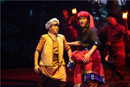 初生的音樂劇《康定情歌》是個(gè)聽話謙遜的孩童,專業(yè)人士的諄諄教誨一定會(huì)牢記在心;他也是個(gè)具有思鄉(xiāng)情結(jié)的游子,自己的一顰一笑都流露出濃郁的民族風(fēng)采;同時(shí)他也是個(gè)頑強(qiáng)拼搏的逐夢(mèng)少年,即便汗水和淚水匯成一道道溝壑,依然挺胸不低頭,只為在明天,成為更好的自己。 (圖片由州歌舞團(tuán)提供)