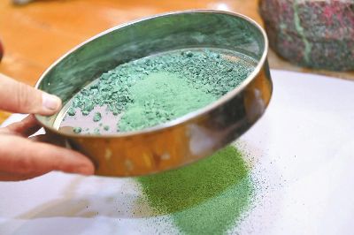 傳統(tǒng)的唐卡是藏族文化中一種獨具特色的繪畫藝術形式,需經(jīng)繃布、打磨、定位、起稿、涂色、暈染、拉線條、拉金線等多種程序,天然原料作色保證了畫作幾百年后色澤還依然鮮艷。在著著的畫室里,擺放了百個裝滿各色礦物質顏料的調(diào)色小碗,“上色用的是延續(xù)千年的礦物研磨顏料?!睘榱俗岊伭献魃鶆?,著著還用自己的辦法搞出了專用的顏料攪拌機。