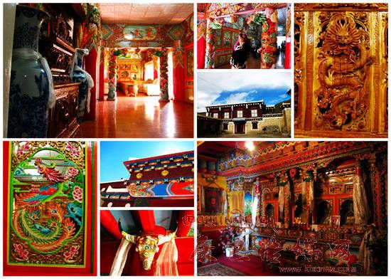 這些民居外表主要由棕白兩色構(gòu)成,白色的屋頂,白色的主墻,木結(jié)構(gòu)處多用棕色顏料染涂,其間配以紅、藍(lán)圖案,在藍(lán)天、白云、青山、綠水的映襯下,幻化成妙不可言的積木圖案。白色的房頂與寬敞的院壩里,身著艷麗藏裝的少女或身著絳紅色衣衫的喇嘛飄拂其間,給人一種“世外桃源”的感覺(jué)。