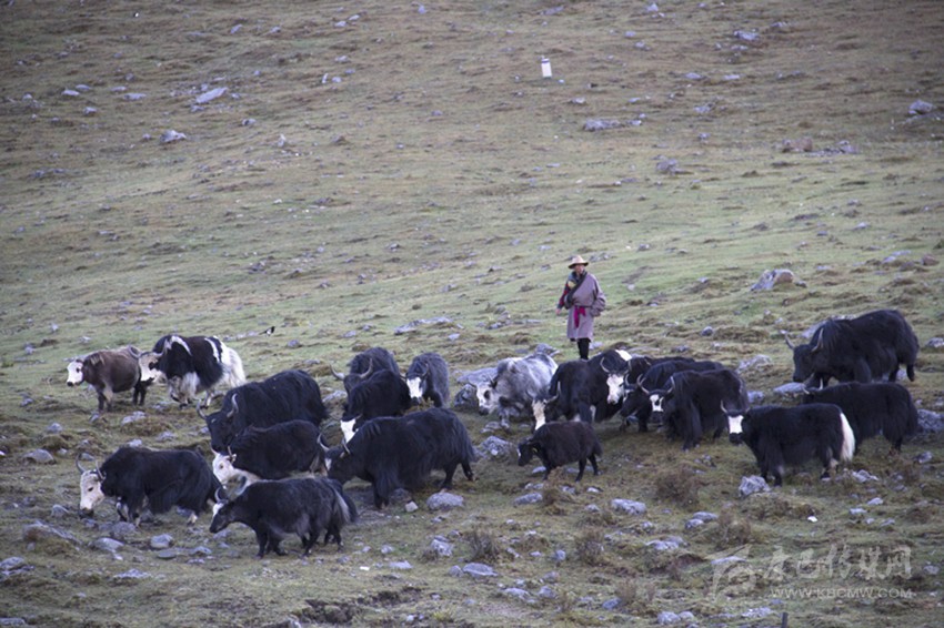 正直初秋,草坪被這個(gè)季節(jié)染成了淺褐色。草地上牦牛和馬匹成群,悠閑的啃著草地現(xiàn)存的幾抹綠意。