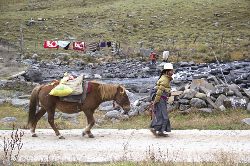 莫斯卡的女人或在寺廟點(diǎn)酥油燈,或帶孩子,或牽馬牧草,或在溪邊淘衣,或出門打水……她們的勤勞和樸實(shí)滋養(yǎng)著莫斯卡,滋養(yǎng)著莫斯卡的生命。她們用黑、紅、綠那樣跳躍的顏色搭配出獨(dú)具風(fēng)格的服飾,背著你遠(yuǎn)去,又迎著你走來,她們美麗的背影裝扮了寂靜的莫斯卡小巷。