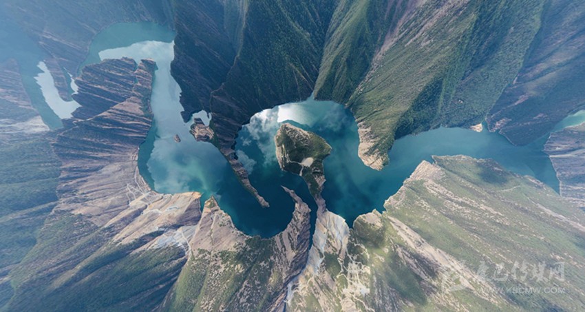 再?gòu)目罩懈╊?,湖水猶如藍(lán)色巨龍蜿蜒山間,“扎西甲波”已成湖心之島與兩旁的“蘇俄蘇日”和“阿帕甲日”被水纏繞相連,北緯30°上下,一個(gè)世間絕無(wú)僅有的奇跡美景,天龍湖就這樣誕生了。