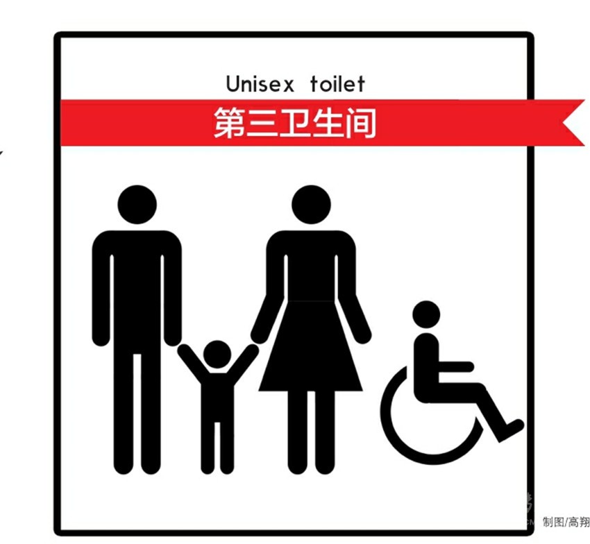 值得一提的是,四川的第三衛(wèi)生間還將有標(biāo)示。《通知》顯示,該標(biāo)示上畫著一對(duì)夫妻牽著孩子,旁邊還有一個(gè)坐著輪椅的行動(dòng)不便者。在畫面下方,注明了“第三衛(wèi)生間”字樣,英文“Unisex toilet”意為“無性別廁所”。 (據(jù)四川在線)