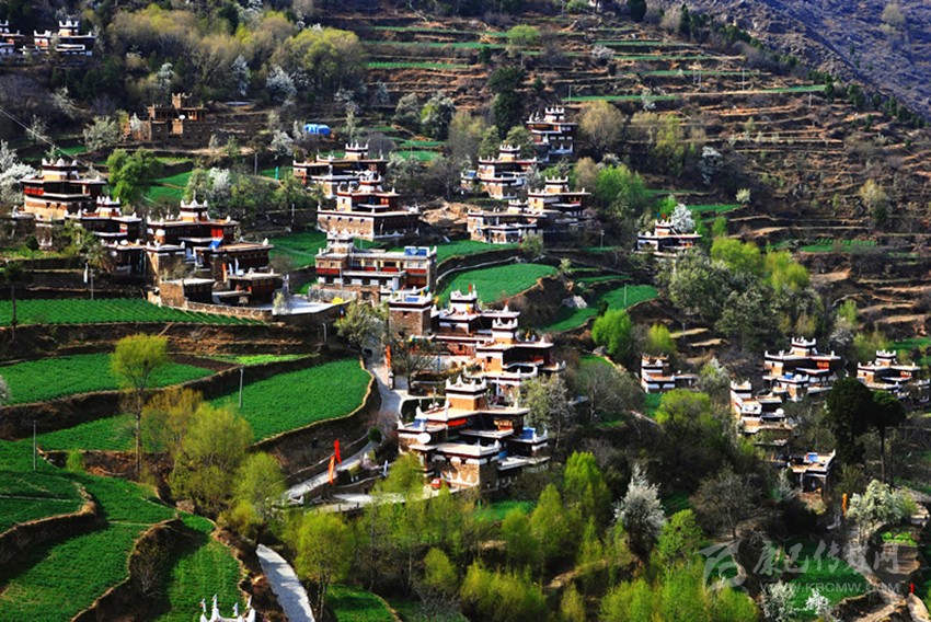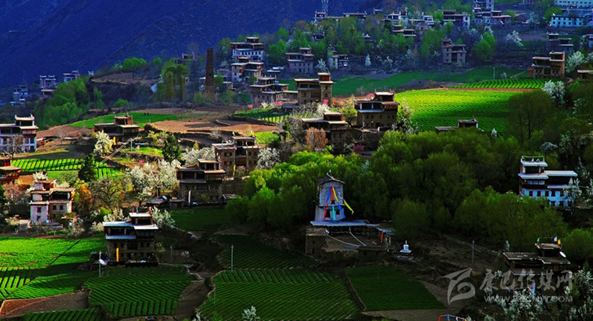 梨花成片,白如雪脂;桃花粉艷,點(diǎn)綴其間。被花海包圍的丹巴,煞是好看。