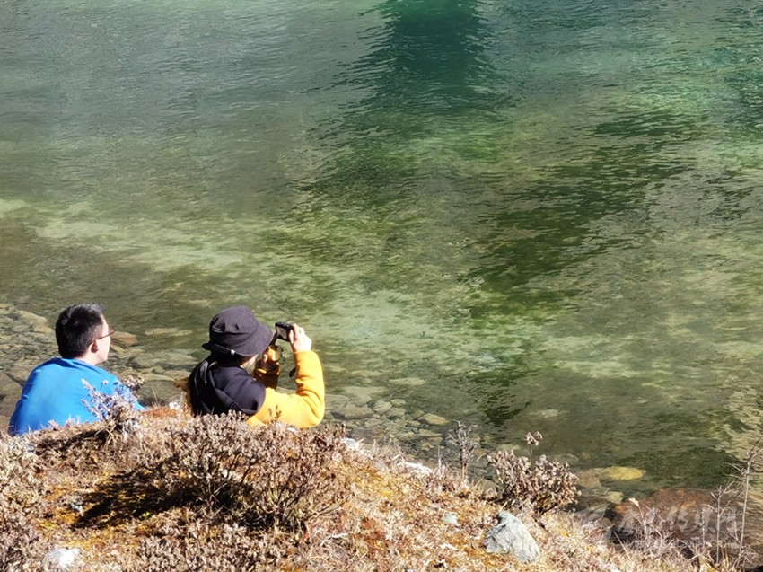 白海子的美較其他海子來說,就在于湖水的顏色,貢嘎青旅的顧問狼哥介紹說,現(xiàn)在大家喜歡叫白海子為翡翠海,就是因?yàn)樗念伾缫粔K藍(lán)綠的翡翠鑲嵌在高山的懷抱中,隨著光線的不同顏色變幻莫測。在康定的眾多海子中,這樣的顏色很少見,也更吸引人。