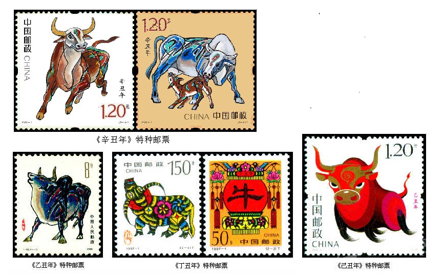 1997年1月5日發(fā)行第二輪生肖郵票中的“牛票”,即《丁丑年》特種郵票,全套2枚。由郵票設(shè)計(jì)師呼振源設(shè)計(jì)。第一枚“金牛奮蹄”,畫面依據(jù)山東省高密縣方市鄉(xiāng)前曹戈莊村當(dāng)時33歲的農(nóng)村女子齊秀花的剪紙作品《媳婦騎牛圖》進(jìn)行設(shè)計(jì),原作中的“媳婦”被刪去,突出了牛的形象,體現(xiàn)出膠東地區(qū)民間剪紙藝術(shù)源于生活、構(gòu)思巧妙、粗獷中多見細(xì)膩的本色。只見那彎彎的牛角,垂地的長尾,壯實(shí)的牛身,穩(wěn)健的四蹄,都真實(shí)地再現(xiàn)了生活中牛的特點(diǎn),牛身上似花非花,似銅錢又非銅錢的紋飾,充分地表現(xiàn)出樸實(shí)的浪漫主義。第二枚“牛耕年豐”,畫面主圖為一只高高掛起的大紅燈籠上,映出了一個醒目的隸書“牛”字,為牛年的慶春象征。圍繞著這只燈籠,又進(jìn)行了幾多創(chuàng)意,兩只喜鵲和一朵梅花,喻意“喜鵲登梅”;旒蘇上的兩朵牡丹,代表幸福、富貴;特別是那春意盎然的“雙牛圖”,畫面雖小,確為點(diǎn)睛之筆,與主圖的大“牛”字緊密呼應(yīng)。