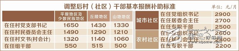 省上明確,此次村(社區(qū))干部基本報酬標準為最低補助標準,各地可根據(jù)經(jīng)濟發(fā)展水平、城鄉(xiāng)居民收入狀況和工作需要進行適當增加調整,重點對村人口在3000人以上、高寒高海拔地區(qū)工作的提高補助標準;對跨村兼職和兼任組干部的提高報酬待遇。各地要進一步完善村(社區(qū))干部基本報酬激勵保障機制,繼續(xù)推行“固定報酬+績效報酬”制度,強化考評激勵,充分調動村(社區(qū))干部干事創(chuàng)業(yè)活力。