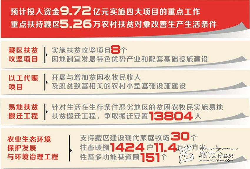 答:比如藏區(qū)扶貧攻堅(jiān)項(xiàng)目,從實(shí)施內(nèi)容來(lái)看,今年在阿壩州、甘孜州、涼山州木里縣實(shí)施扶貧攻堅(jiān)項(xiàng)目8個(gè),其中阿壩州3個(gè)、甘孜州4個(gè)、涼山州木里縣1個(gè),預(yù)計(jì)投入中央財(cái)政專(zhuān)項(xiàng)扶貧資金4000萬(wàn)元,表面上延續(xù)了去年的工作,但今年實(shí)施項(xiàng)目將突出兩大要求,一是項(xiàng)目要瞄準(zhǔn)今年有計(jì)劃摘帽的貧困村、計(jì)劃脫貧的貧困戶(hù),集中力量解決突出問(wèn)題。二是項(xiàng)目資金要到村入戶(hù),因地制宜發(fā)展特色優(yōu)勢(shì)產(chǎn)業(yè)和配套基礎(chǔ)設(shè)施建設(shè),確保精準(zhǔn)扶貧。