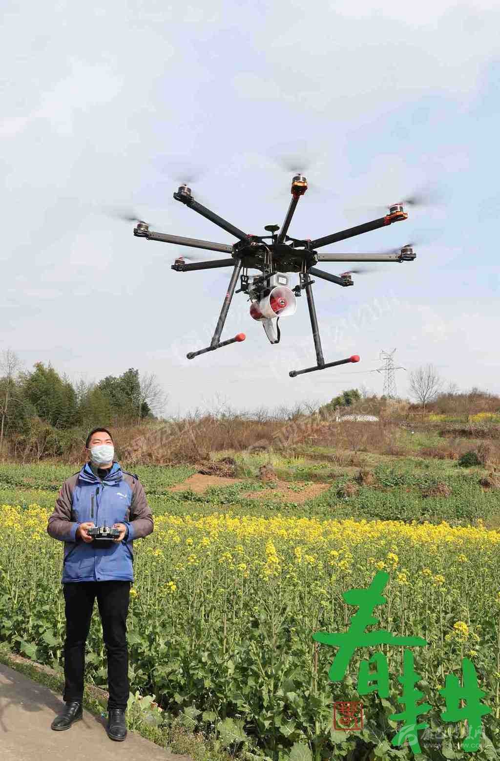 彭州市桂花鎮(zhèn)高峰村,技術(shù)員操作無人機(jī)穿梭在田間。