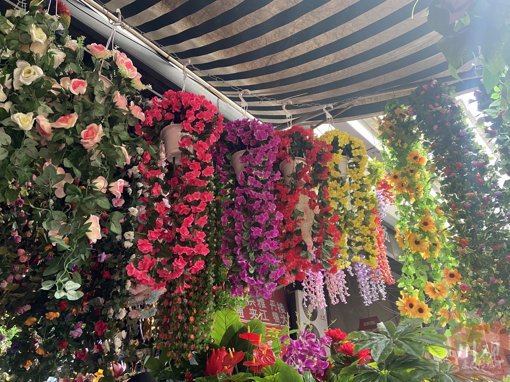 在荷花池批發(fā)市場(chǎng)的一家假花店,幾個(gè)嬢嬢正七嘴八舌地指揮老板在從天花板垂下來的枝條中,選出最亮眼的那叢。