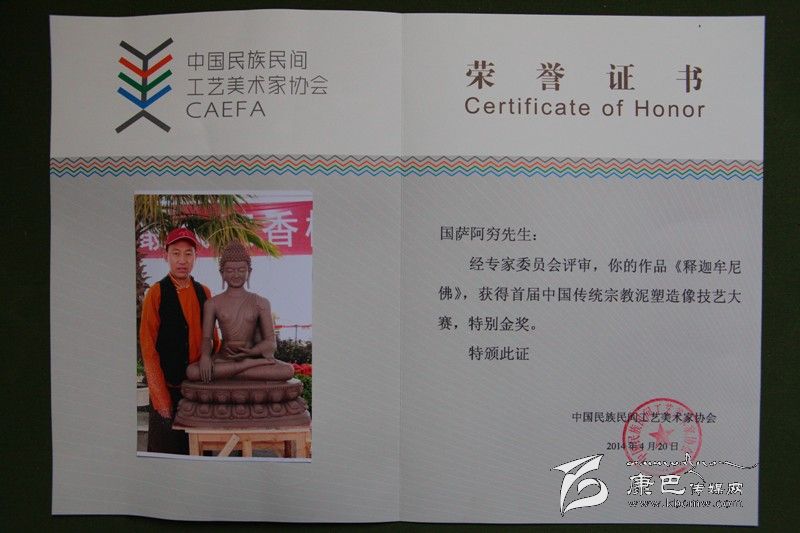 由中國民族民間工藝美術家協(xié)會主辦的“首屆中國宗教泥塑技藝大賽”,旨在傳承宗教泥塑造像技藝,搭建宗教造像藝術家展示平臺。本次大賽共有來自臺灣、香港、天津、河北、四川、西藏、云南、浙江、江蘇、貴州、江西、寧夏、江西等地的39名泥塑高手現場制作,角逐獎項。我州的國薩阿窮等三名藝人現場制作的泥塑作品《釋迦牟尼》榮獲特別金獎,同時,國薩阿窮還榮獲了“中國傳統(tǒng)工藝美術大師(宗教雕塑)”榮譽證書。